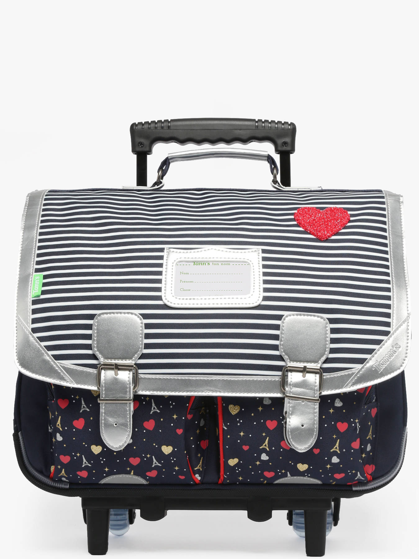 41 cm - 20 litres - 2.5 kg ~ Idéal pour le CM1 et le CM2, ce cartable à roulettes 2 compartiments de la marque TANN’S est conçu en polyester recyclé, il allie durabilité et respect de l’environnement. Son rabat à fermoir sécurise parfaitement les effets personnels. Il dispose de deux poches avant pratiques pour ranger les petits objets à portée de main, et de bretelles réglables pour un port confortable lorsque le cartable est porté sur le dos. À l’intérieur, ses deux compartiments spacieux et ses deux poches zippées permettent une organisation optimale du matériel scolaire. Sa contenance généreuse permet d’y glisser un dossier A4, des cahiers jusqu’au format 24x32 cm ainsi qu’un classeur de comptabilité. Ce cartable à roulettes est l’alliance parfaite entre style, praticité et résistance pour suivre les enfants dans toutes leurs journées d’école.