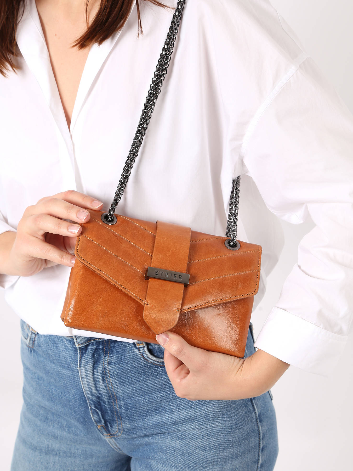 The ETRIER JANA AMOUR crossbody bag is available in two sizes, presented here in its mini version. Offered in new seasonal colors, this beloved model has been crafted in Italy. Its slightly shiny leather with a crackled effect and quilted design adds uniqueness to this handbag. Made of cowhide leather, it closes with a flap secured by a magnetic snap. Featuring a chain and leather shoulder strap, it can be worn crossbody or over the shoulder. Inside, two compartments accommodate a slip pocket and a zip pocket, all lined with cotton for a polished finish.