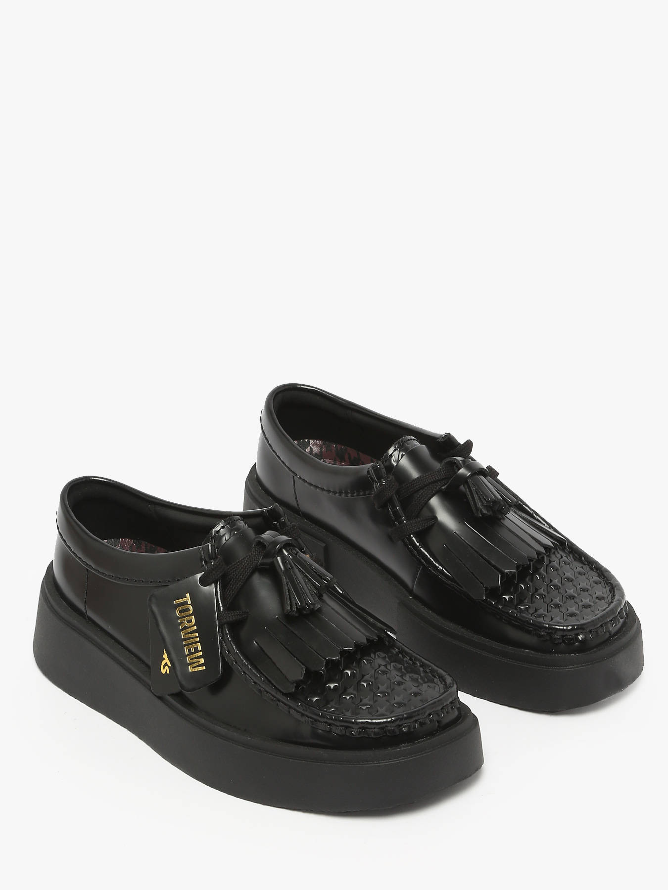 The Clarks Torview shoes combine casual style with a contemporary edge. Crafted from premium black leather, they feature an elegant design enhanced by a removable kiltie fringe on top and a detachable tassel, allowing for a personalized look. Their chunky and durable outsole gives them a bold, modern aesthetic, ideal for everyday wear. Equipped with a molded Contour Cushion footbed, they deliver outstanding comfort with every step, while the breathable leather lining and insole ensure a pleasant feel throughout the day. To complete the design, the pair comes with a branded Clarks keychain, adding a distinctive and timeless finishing touch.
