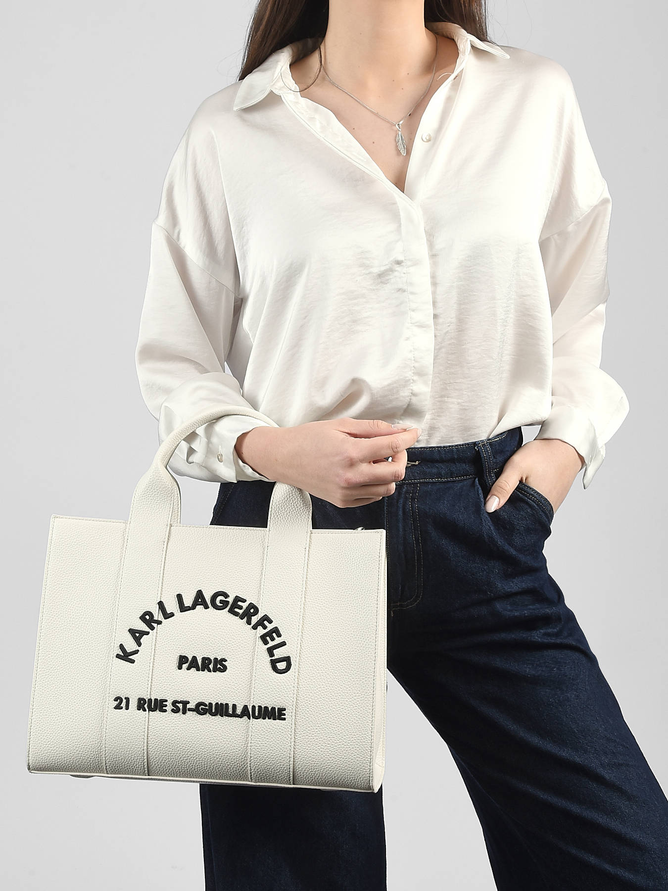 The RSG KARL LAGERFELD handheld bag, crafted from cowhide leather, combines elegance and durability. Its smooth exterior is enhanced by a zip closure that secures your belongings while providing great everyday practicality. The 11 cm handle height offers a comfortable handheld carry, while the adjustable and removable shoulder strap gives the option of crossbody wear, adapting to all your needs and occasions. Inside, a single compartment and a simple pocket allow for easy organization of essentials. This bag perfectly embodies KARL LAGERFELD’s chic and contemporary spirit, adding a refined touch to any outfit, whether for a casual outing or a more formal occasion.