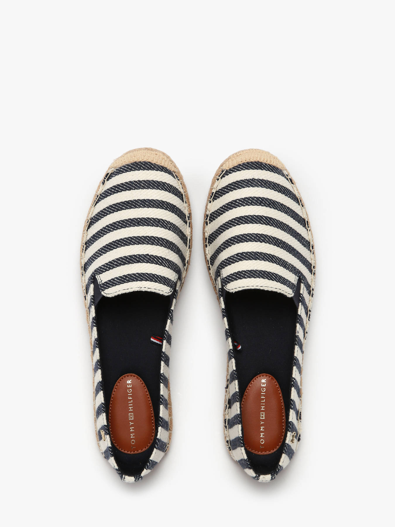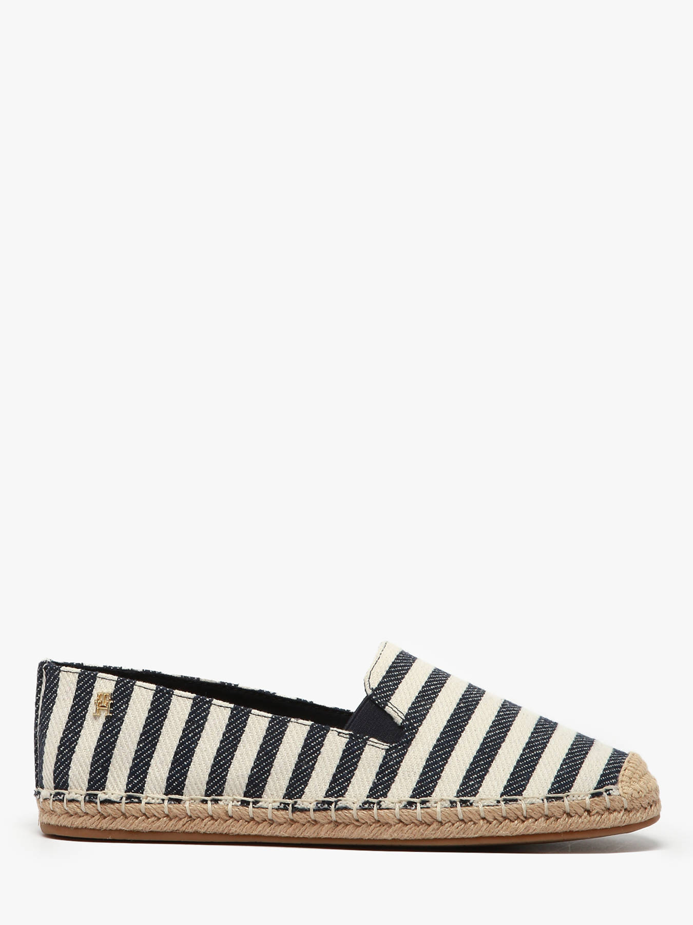 Show off a refined summer style with these striped espadrilles from TOMMY HILFIGER. Designed with a lightweight cotton upper, they offer a comfortable and breathable feel, perfect for sunny days. The wide stripe pattern and the jute-covered midsole add a timeless summer touch, while the thermoplastic rubber outsole ensures excellent grip. Elastic side panels provide a perfect fit, and the TH monogram plaque on the heel highlights the iconic branding. Featuring TOMMY HILFIGER branding, these espadrilles offer both comfort and style for your summer outfits. Available in space blue itacha stripes, they are perfect for adding a stylish touch to your casual looks.