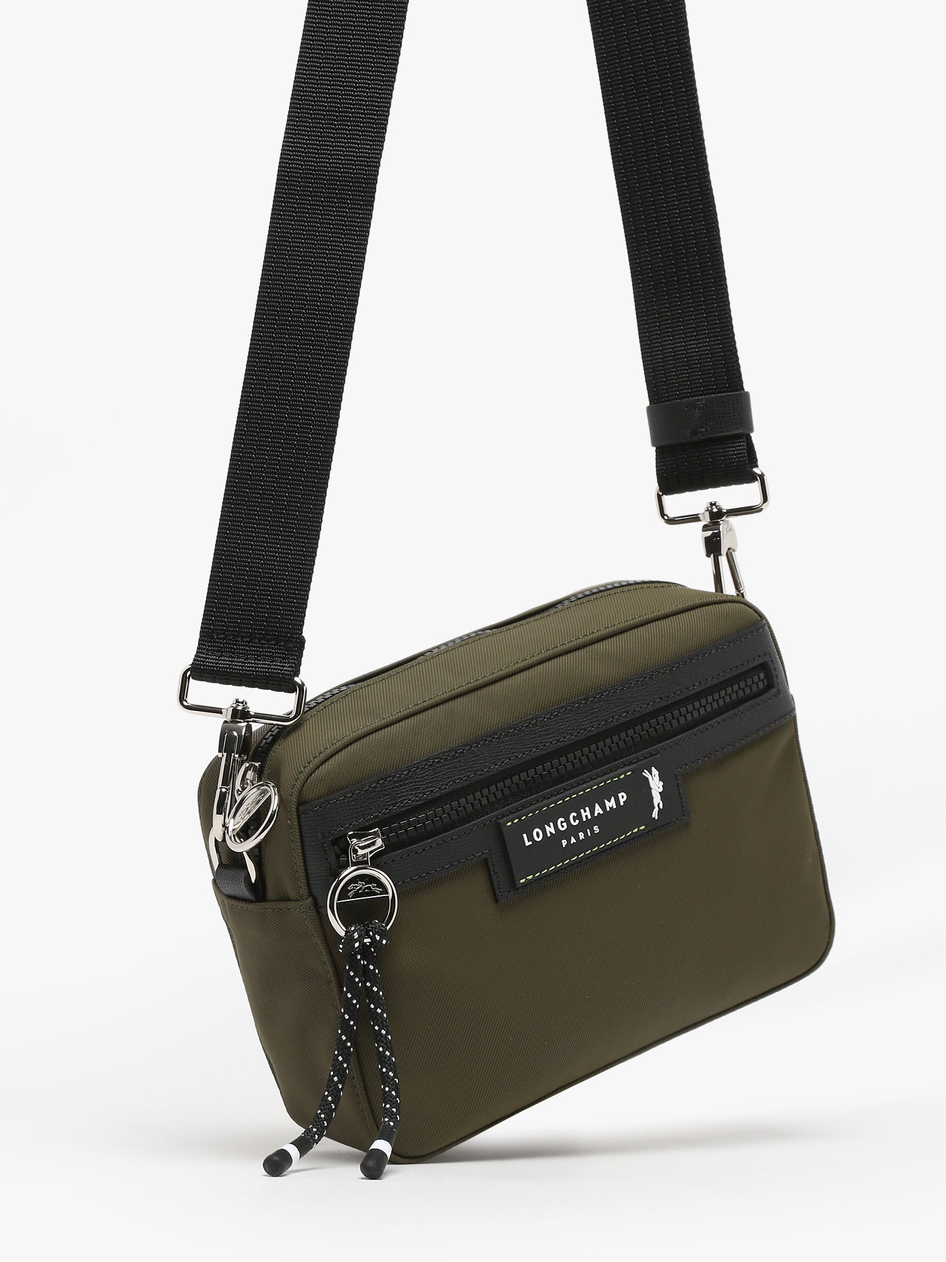 Sachez que nous avons chez Edisac immédiatement aimé ce sac bandoulière Longchamp Green District pour : son agréable et sa résistante matière en toile polyamide recyclée certifié Econyl, ses accessoires métalliques argentés, sa garniture en cuir de vachette et sa doublure en textile recyclé. De plus, cette pièce comporte d’autres détails intérieurs comme une poche glissière, et extérieurs (deux poches zippées, une fermeture zippée et une bandoulière réglable et amovible).