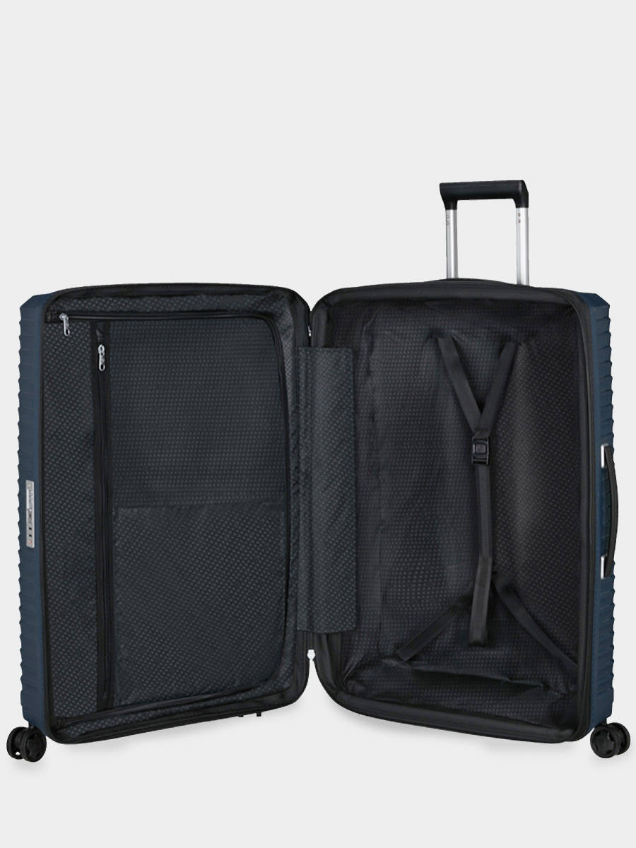 Choose comfort with Upscape. Travel carefree with its lightweight, shock-absorbing suspension wheels and removable, washable inner lining. The ultra-convenient stretch and silver lining will only add to the fun of your travels. With 4 shock-absorbing, noise-reducing suspension wheels, a TSA combination lock for added security and a double-tube telescopic handle, the Samsonite Uspcape will follow you wherever you go. The interior is made from recycled polyester and features two compartments with either a strap or zip closure to keep everything in place during transport.
