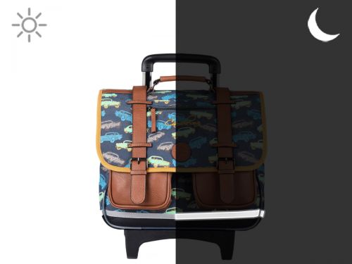 38 cm - 15 liters - 2.33 kg ~ Children's wheeled school bag 38 cm from the Vintage Urban line by Caméléon. Ideal for CP, CE1 and CE2. Composed of 2 compartments separated by a central zipped pocket, this children's satchel is designed to store all school items. It can hold A4 notebooks format. Practical, the interior consists of a zipped pocket, a special ruler space and an elastic for a water bottle. The exterior zipped pocket is ideal for storing small items such as the diary or snacks. To roll the satchel, the shoulder straps must be stored in the pocket on the back. Both reinforced and padded, this satchel provides comfort and resistance. On the security side, it has reflective bands on the front and on the shoulder straps of the satchel. Made from waterproof recycled polyester. Little more, the rule is offered!